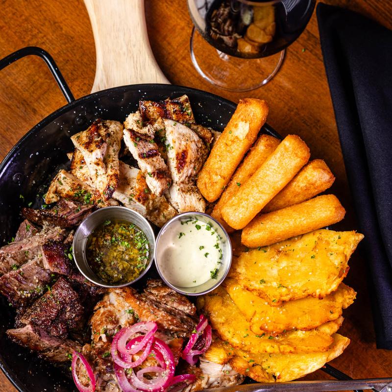 (Baby Churrasco, Pechuga de Pollo, Masitas de Cerdo Fritas, Chorizo Español, Tostones y Yuca Frita) + 2 Acompañantes